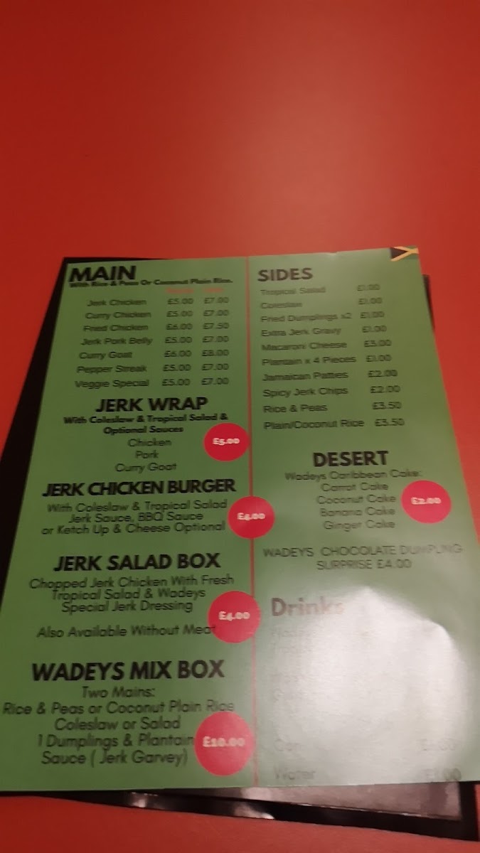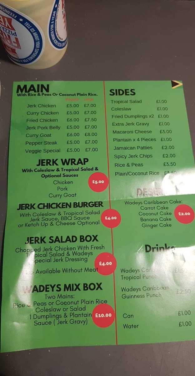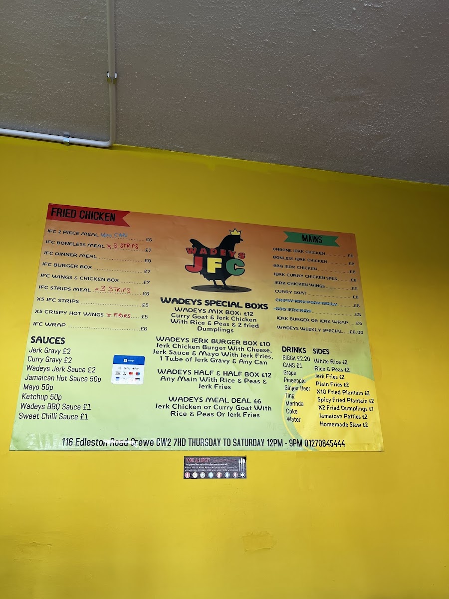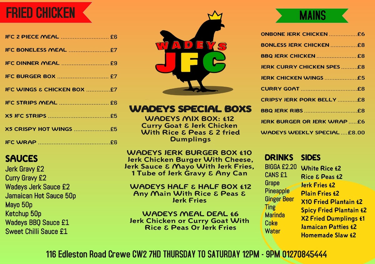 Introducing Wadeys Jerk Fried Chicken, a vibrant gem nestled on Edleston Road in Crewe. This Jamaican restaurant serves up an array of flavors that transport diners straight to the heart of the Caribbean. The menu features the star attraction: JFC fried chicken, available in various formats like the JFC 2 Piece Meal and the JFC Burger Box, each bursting with personality and spice. But the offerings don't stop there; sides like jerk fries, rice & peas, and homemade slaw accompany hearty meals, ensuring satisfaction in every bite.